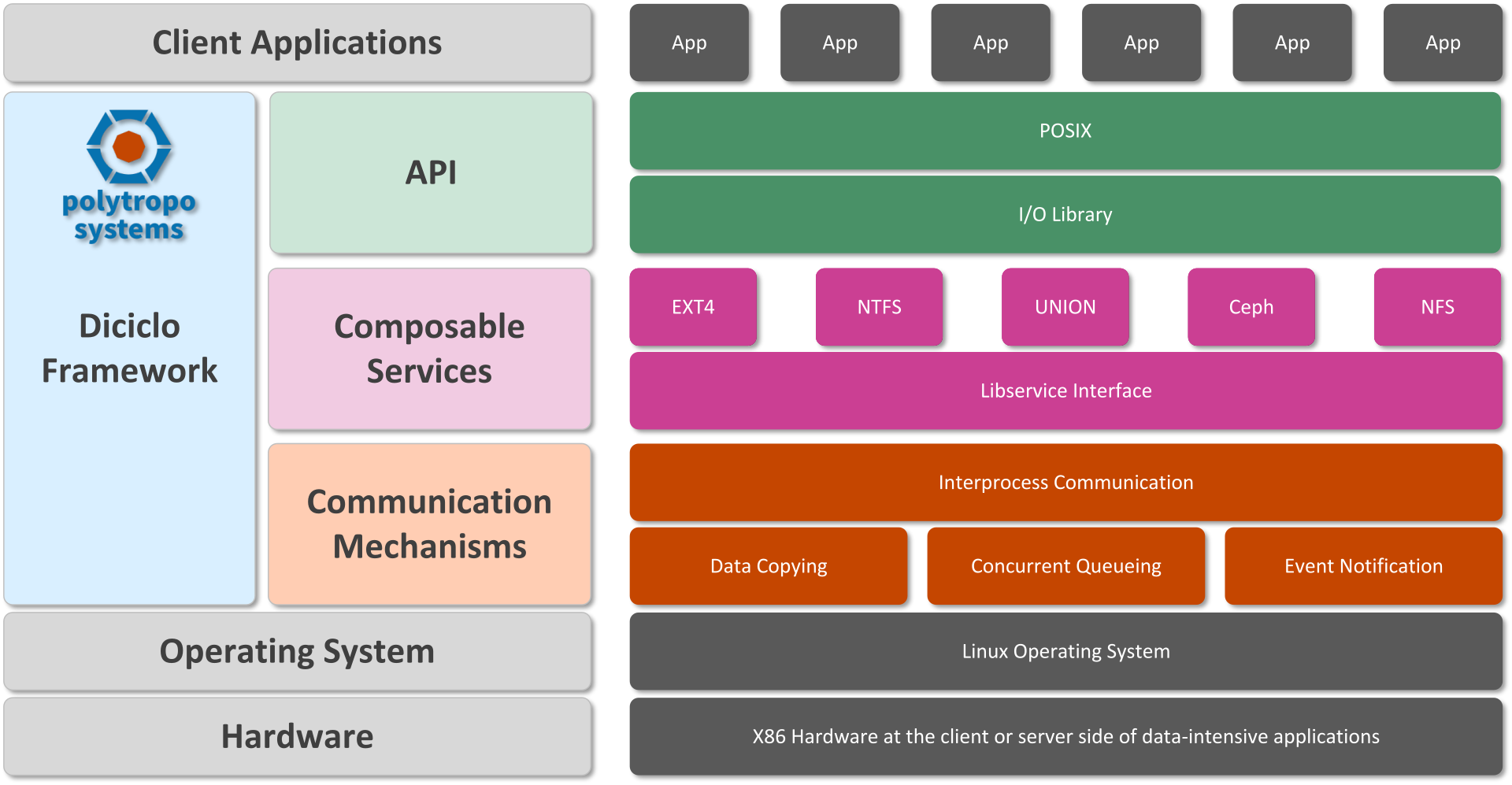 We offer ready-to-use client-side standalone software that provides isolated access to several local (Ext4, NTFS, Union) and distributed filesystems (Ceph, NFS).